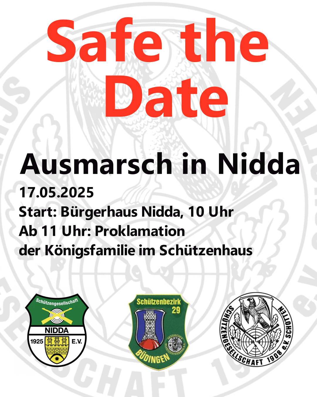 Die SG Nidda lädt am 17.05.2026 zum Saisonauftakt der Schützenausmärsche des Schützenbezirks 29 Büdingen ein.